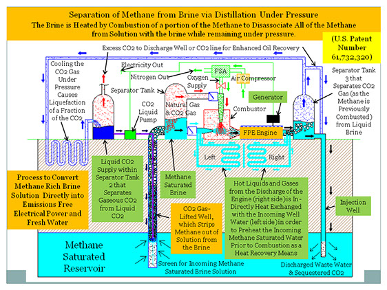 The Technology is capable of the conversion of methane saturated brine directly into emissions free electrical power; fresh water; and carbon dioxide capable of supporting enhanced oil recovery (EOR) projects or alternatively the CO2 gas is sequestered into the formation to generate power without any harmful emissions or other harmful environmental effects whatsoever.