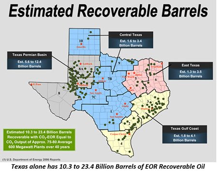 The estimated EOR recoverable barrels from old oilfields in Texas alone is estimated to be between 10.3 to 23.4 billion barrels as shown on the chart below with only the Texas Permian Basin having seen any significant amount of EOR activity at present mainly due to the presence of CO2 pipelines.