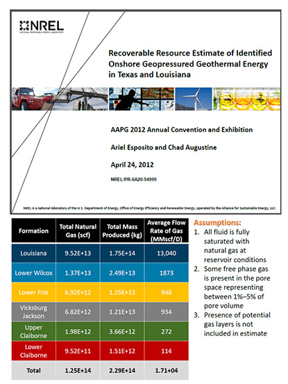 "Recoverable Resource Estimate of Identified Onshore Geopressured Geothermal Energy in Texas and Louisiana", dated April 24, 2012, also by Ariel Esposito and Chad Augustine.