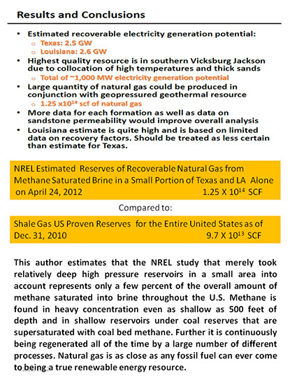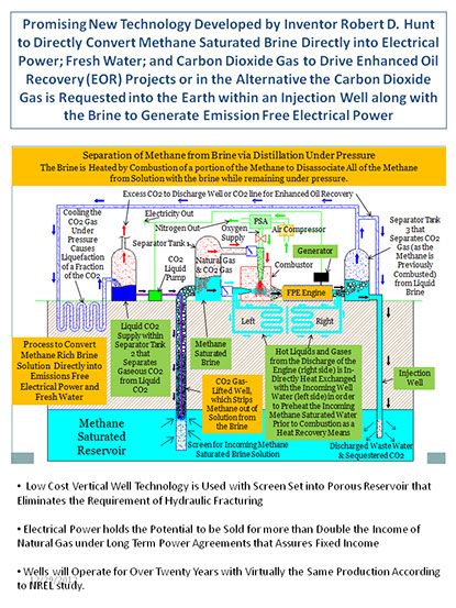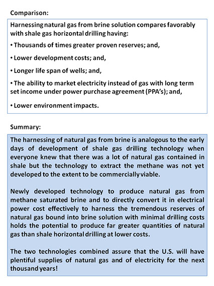 The amount of proven reserves of natural gas saturated into brine is on the order of thousands of times greater than that of shale gas as is shown herein; and, the costs of the process to harness this unconventional natural gas production along with the generation of electrical power is much lower than the costs associated with shale gas, because:
